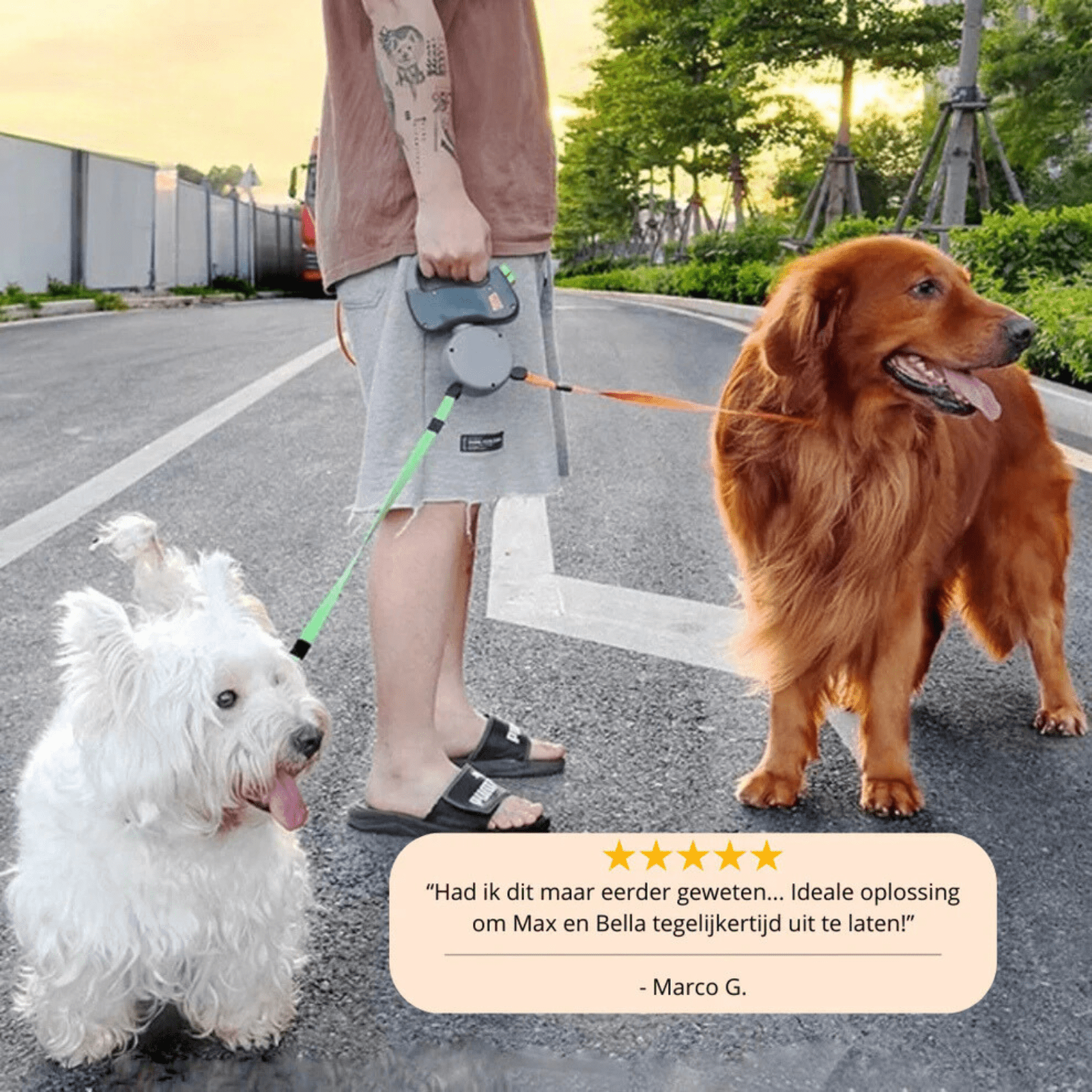 Het ergonomische ontwerp voorkomt vermoeide handen en maakt het gebruik prettig. Met zijn moderne look trekt deze riem de aandacht, vooral wanneer je twee honden tegelijkertijd uitlaat.