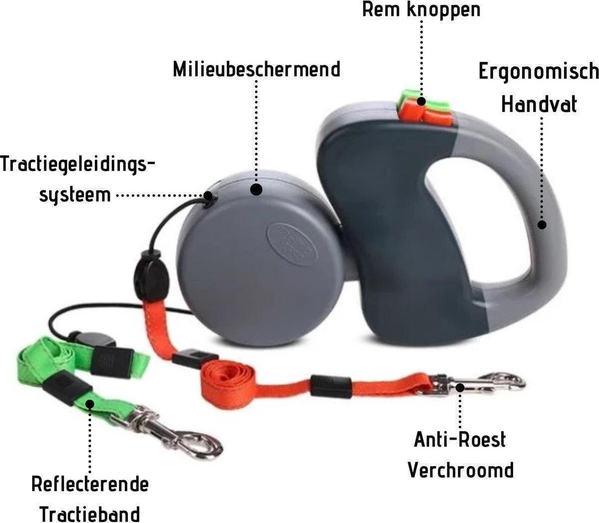 De riem is speciaal ontworpen voor honden tot 22,7 kg en heeft een lengte van 3 meter per lijn. Met de rode knop bedien je de rode lijn, en de groene knop de groene lijn. Gebruik de grote knoppen om de lijn te vergrendelen en de kleine knoppen om deze weer los te maken.