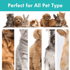 - Verschiedene Aufsätze: Geeignet für verschiedene Felltypen von Hunden, Katzen und anderen Haustieren, mit Bürsten- und Trimmeraufsätzen für die komplette Fellpflege.