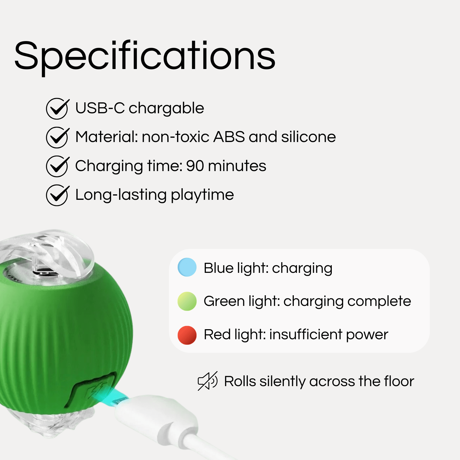 - Leise: Der Ball rollt geräuschlos, sodass Ihre Katze oder Ihr Hund ungestört spielen kann.