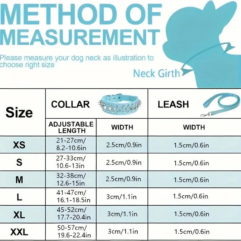 Make your dog stand out with this cool leather spiked collar and matching leash! Made from high-quality faux leather and finished with metal studs for a rugged look. The adjustable fit ensures comfort, while the sturdy buckle and D-ring provide extra security during walks. Perfect for strong, confident dogs who love adventure. Suitable for outdoor use and ideal for breeds such as Pitbull, Rottweiler or Bulldog. Stylish and functional in one set!