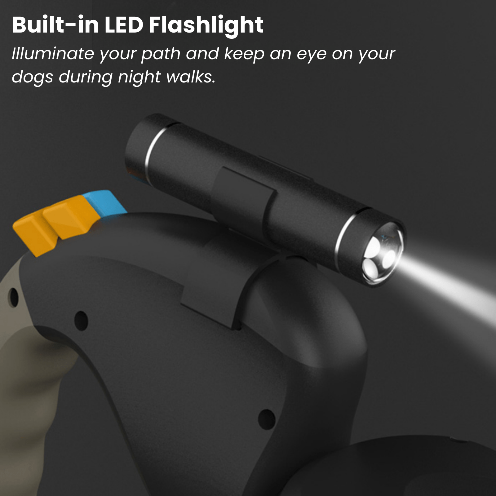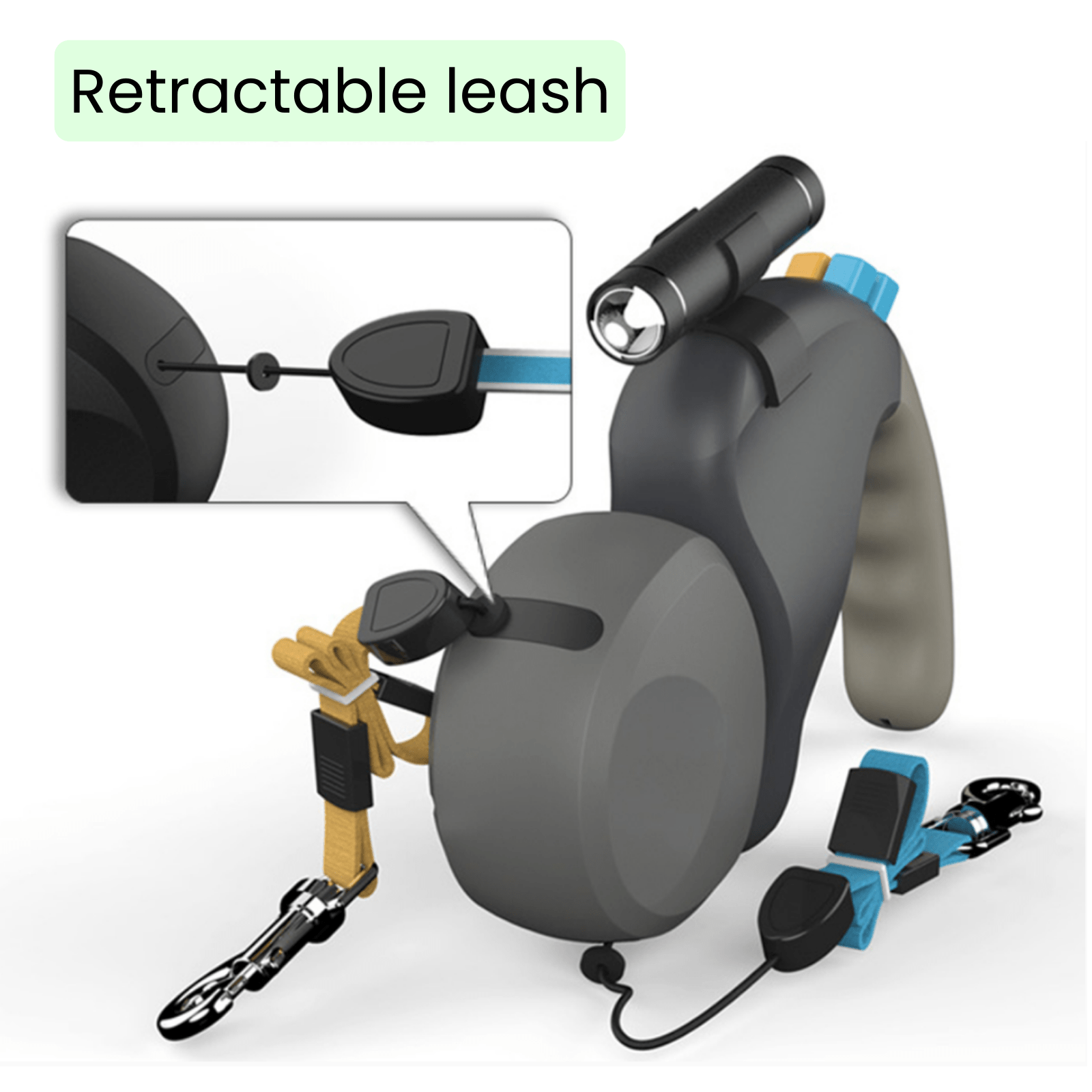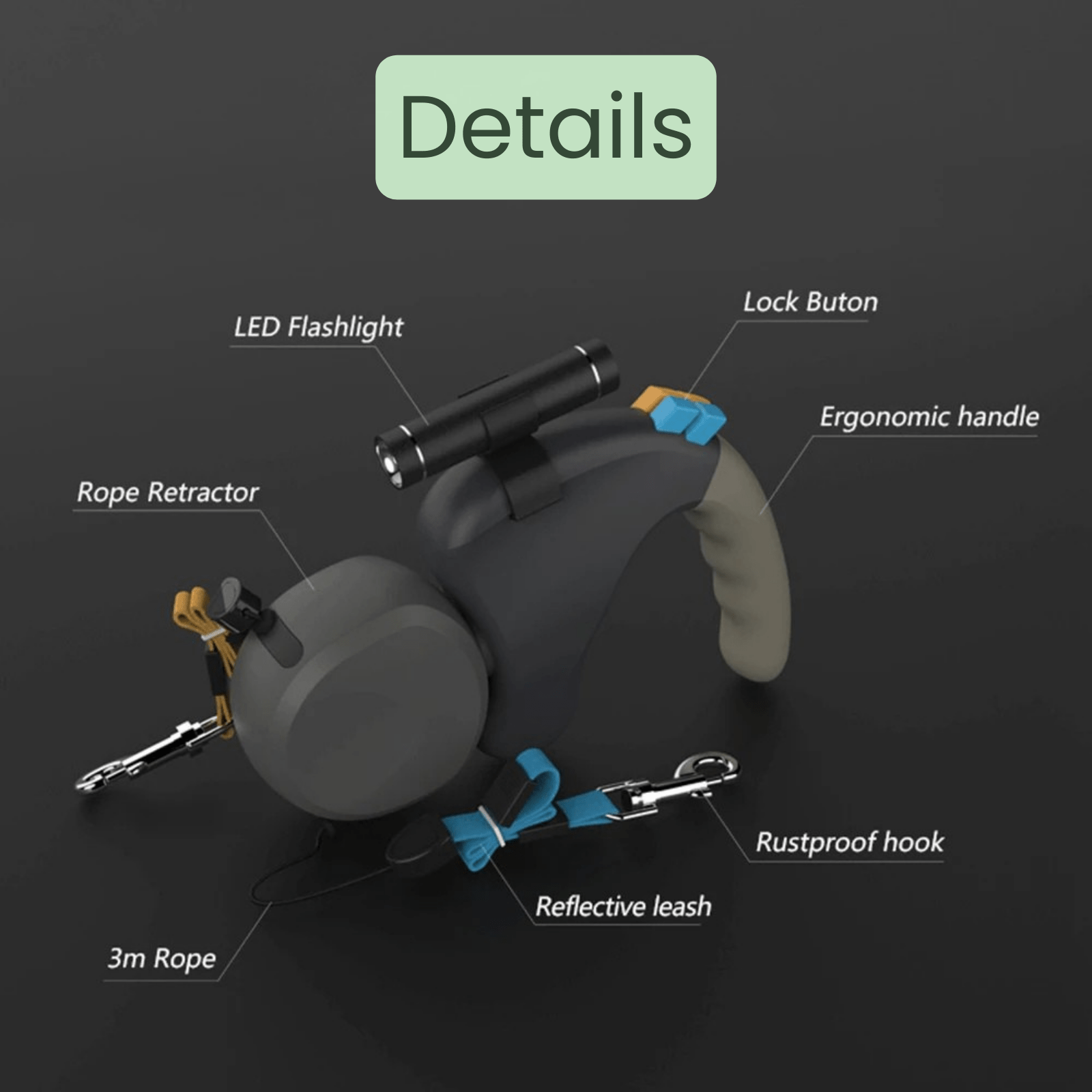 This dog leash features two automatically retractable leashes that rotate 360 ​​degrees, ensuring they never get tangled. This gives each dog plenty of freedom of movement. You can restrain each dog individually, ensuring optimal control during walks.