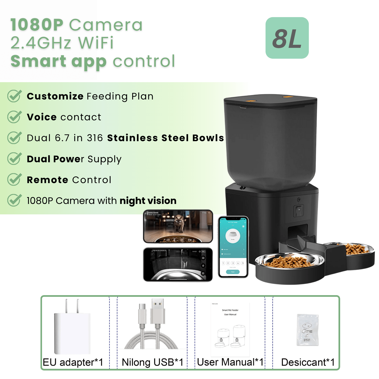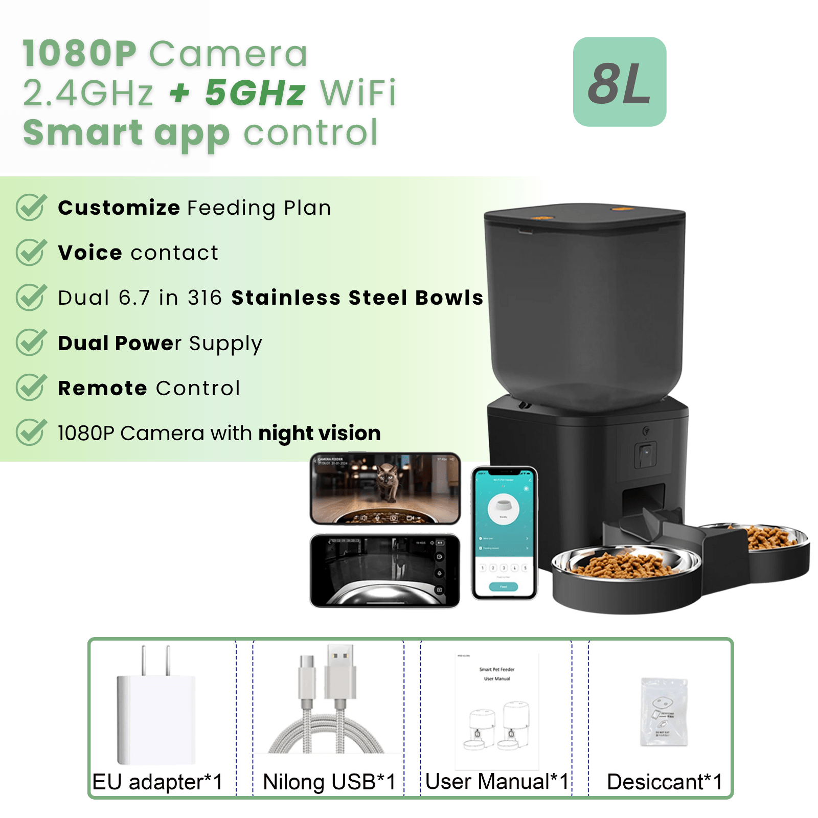 • Smart WiFi Connection (2.4G/5G): Stable connection via Tuya or Pet Zero app – manage feeding times, portions, and watch videos anywhere, anytime.