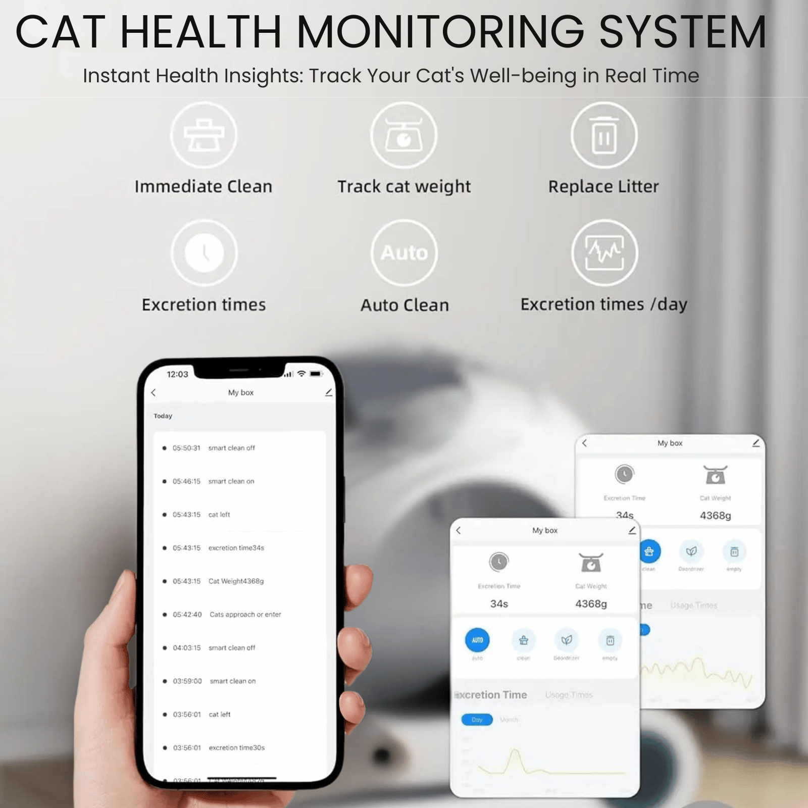 • Smart app control: Control and monitor the litter box remotely via the app. You'll receive notifications about usage data, litter level, and cleaning status—even when you're traveling.