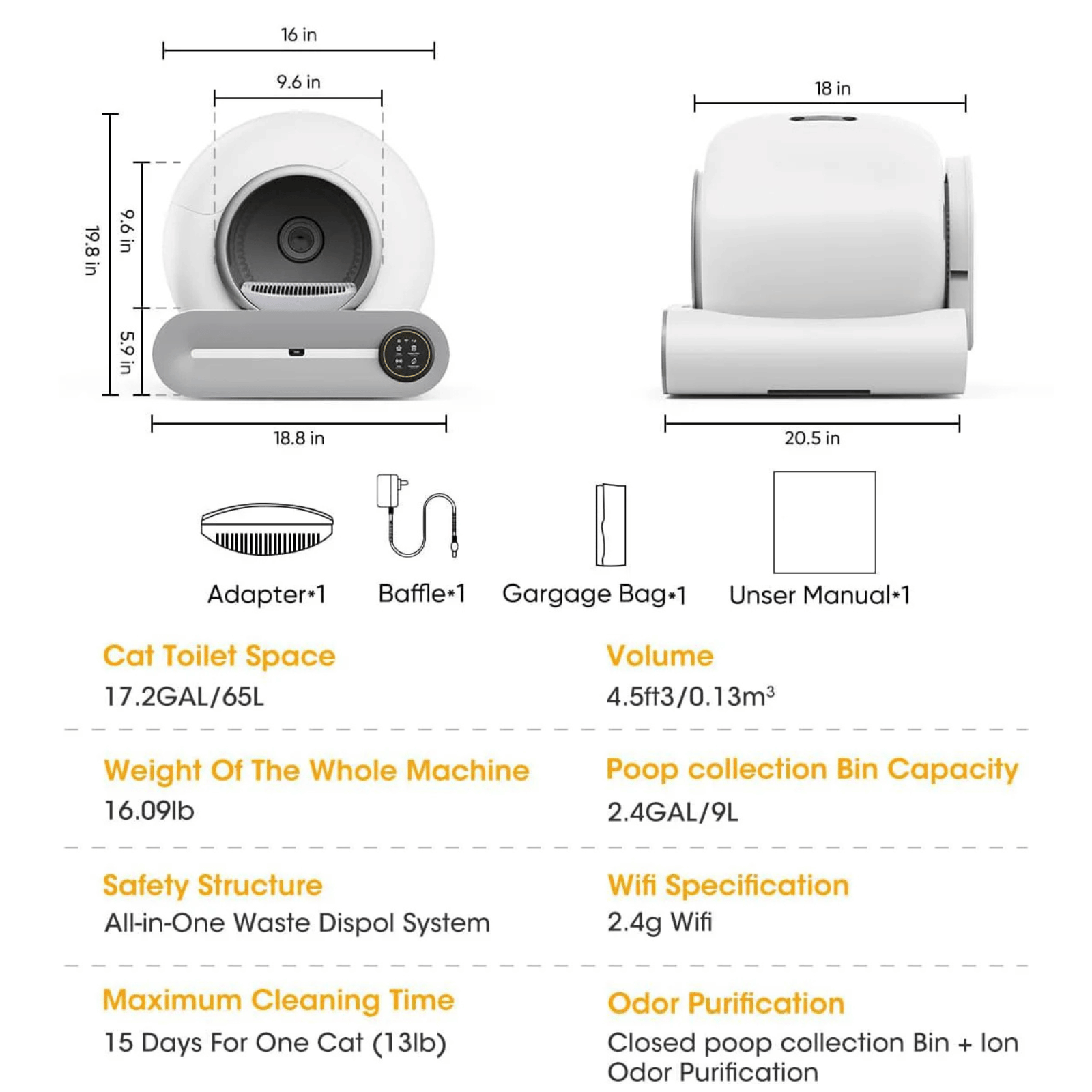 • Fully automatic cleaning: The litter box has automatic cleaning modes and a convenient one-click function to empty old cat litter in one go.