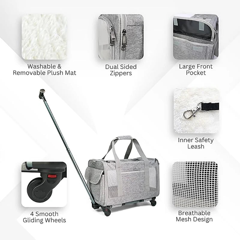 • Convenient mobility: Thanks to the smooth-rolling wheels and telescopic handle, you can move effortlessly through airports, stations or busy streets without having to carry your pet.