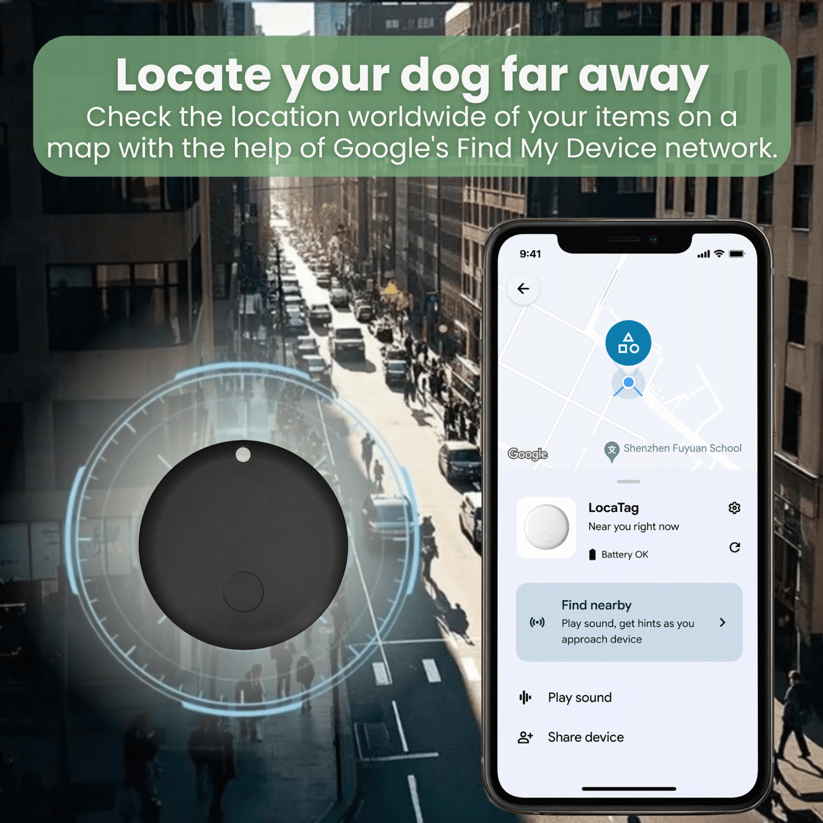 The PetLocate Tracker utilizes the extensive Apple Find My™ network. This means that as long as there are Apple devices near your pet, their location can be tracked – anywhere in the world and with unlimited distance.