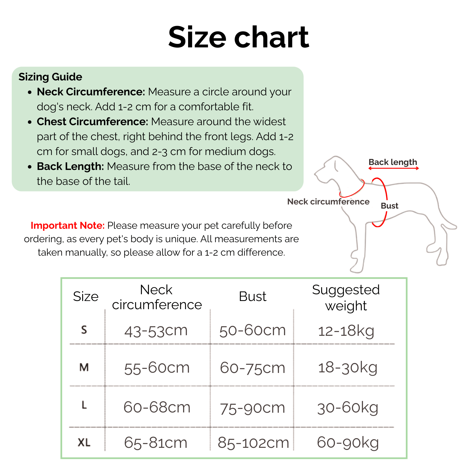 Please note: Please carefully measure your dog's neck and chest circumference before ordering for the best fit.