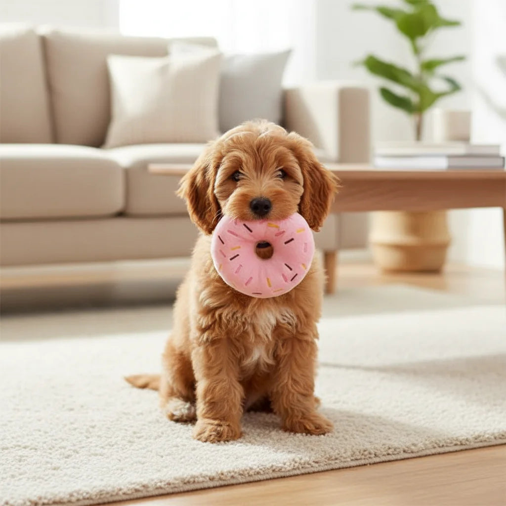 This cute donut-shaped plush dog toy is ideal for both small and medium sized dogs. It provides hours of fun and helps promote healthy chewing. The built-in squeaker adds extra interaction and fun, while the soft plush material ensures your dog can play safely and comfortably. Perfect for pups who love to play, bite and interact with toys.